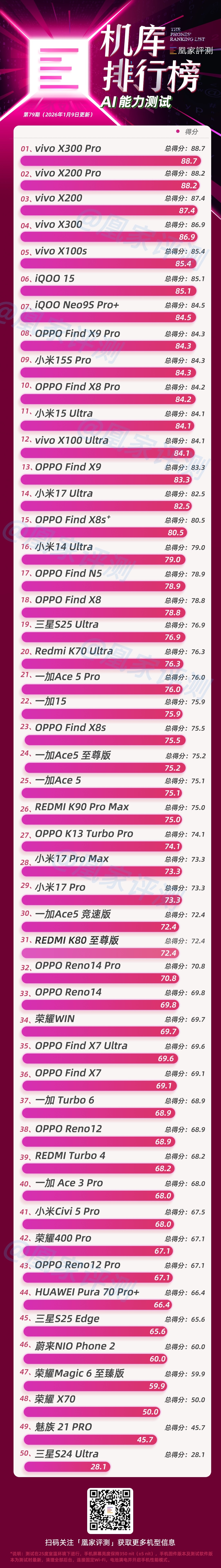 在 AI 性能测试中,小米17 Ultra以82.5分位列第14名、荣耀WIN和一加 Turbo 6分别以69.7分和68.9分,位列榜单第34和第37名