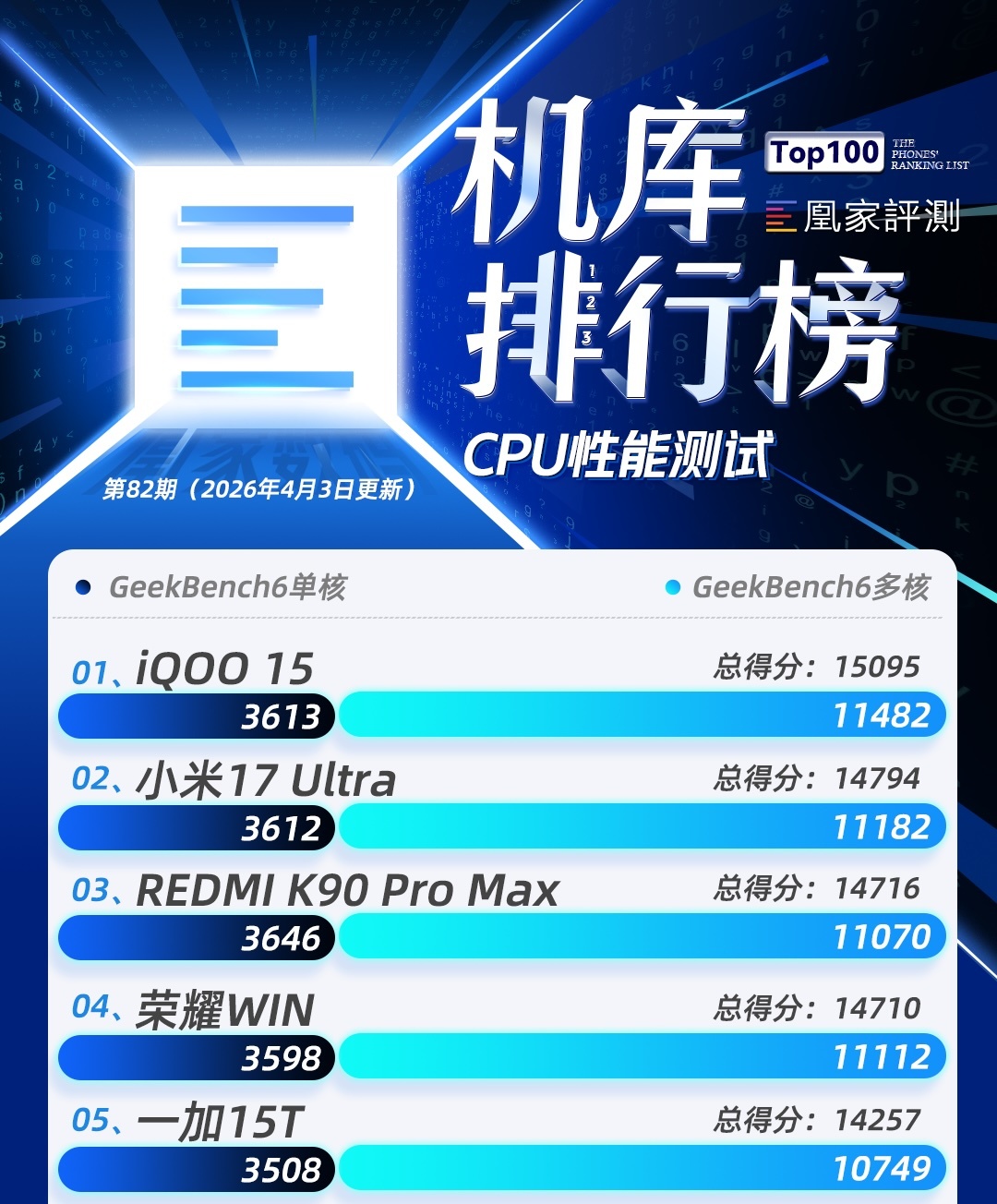 凰家评测发布第82期「机库排行榜」系列榜单,本期新增iPhone 17e、iQOO Z11、OPPO Find N6以及一加15T在 CPU、「原神3.0」、充电、续航以及 AI 方面的榜单实测数据。